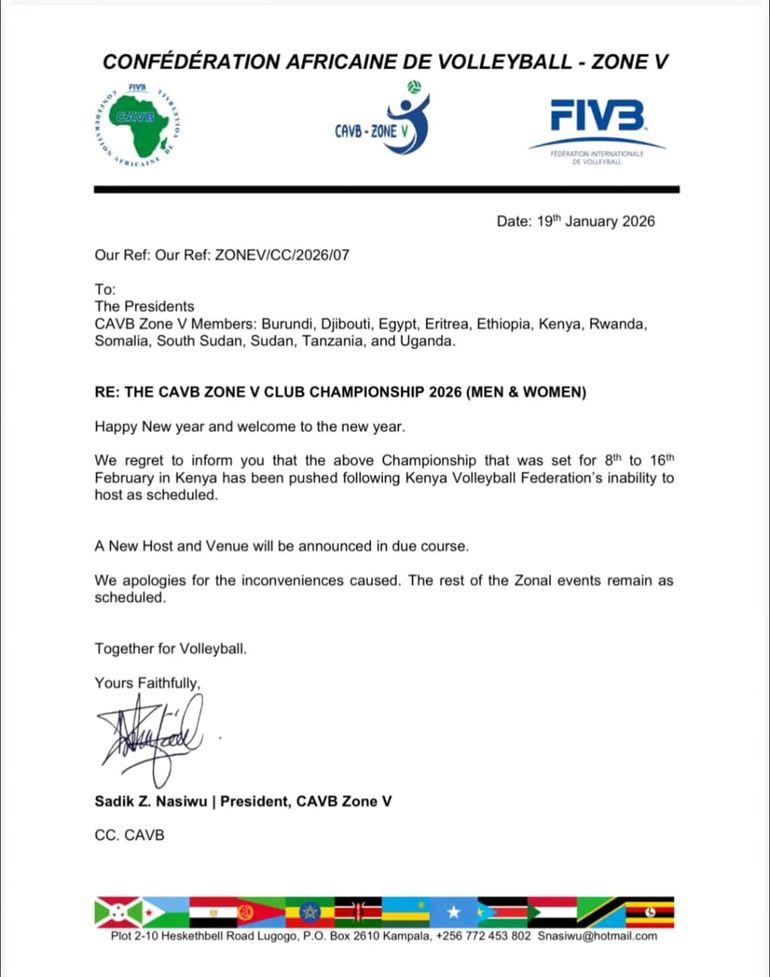 “We regret to inform you that the above Championship that was set for 8th to 16th February in Kenya has been pushed following Kenya Volleyball Federation’s inability to host as scheduled,” said CAVB Zone V President Sadik Nasiwu via a circular.