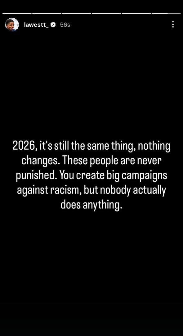 “2026, it’s still the same thing, nothing changes. These people are never punished. You create big campaigns against racism, but nobody actually does anything," he wrote in a separate post on his Stories.