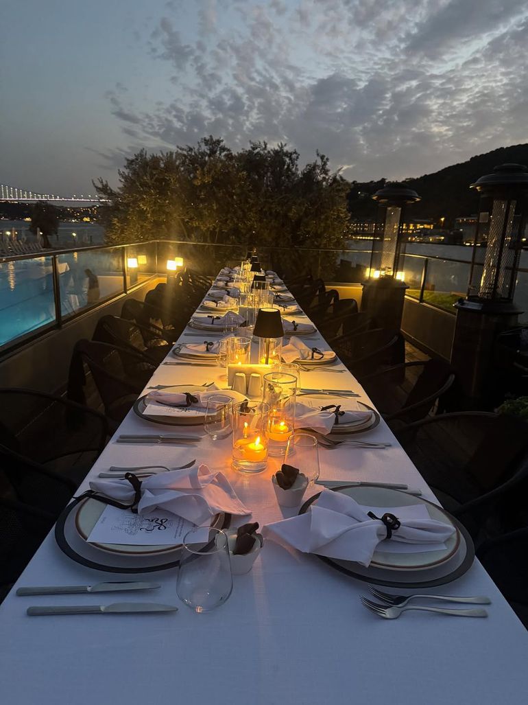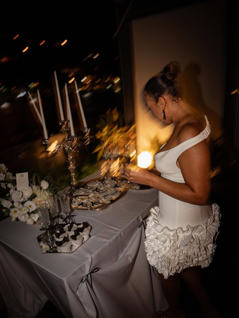 The table was elegantly set with white linen, gold-rimmed plates and black ribbon-tied napkins, with the glow of candles casting a warm light against the backdrop.