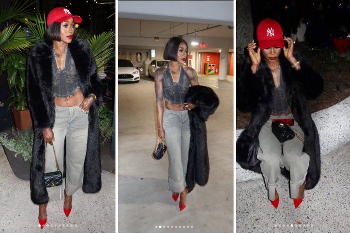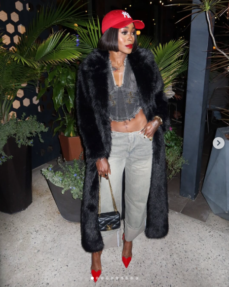 Dressed in denim jeans and a crop top, the world's fastest woman alive completed her looks with a fluffy black long coat, red shoes and a baseball cap to give that electrifying look on a night out.
