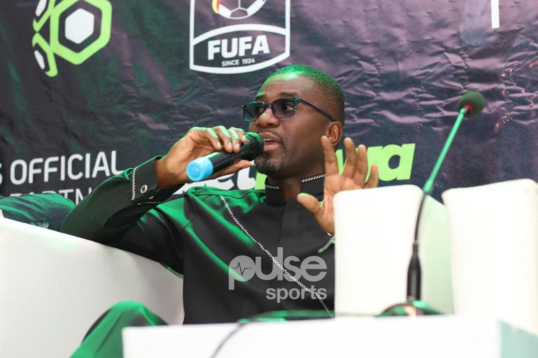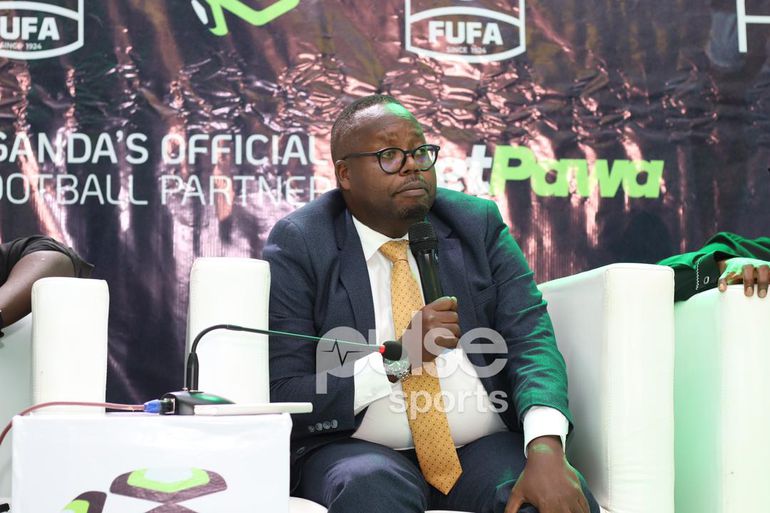 Rogers Byamukama, FUFA EXCOM member, speaks during the partnership unveiling between BetPawa and FUFA| Pulse Sports