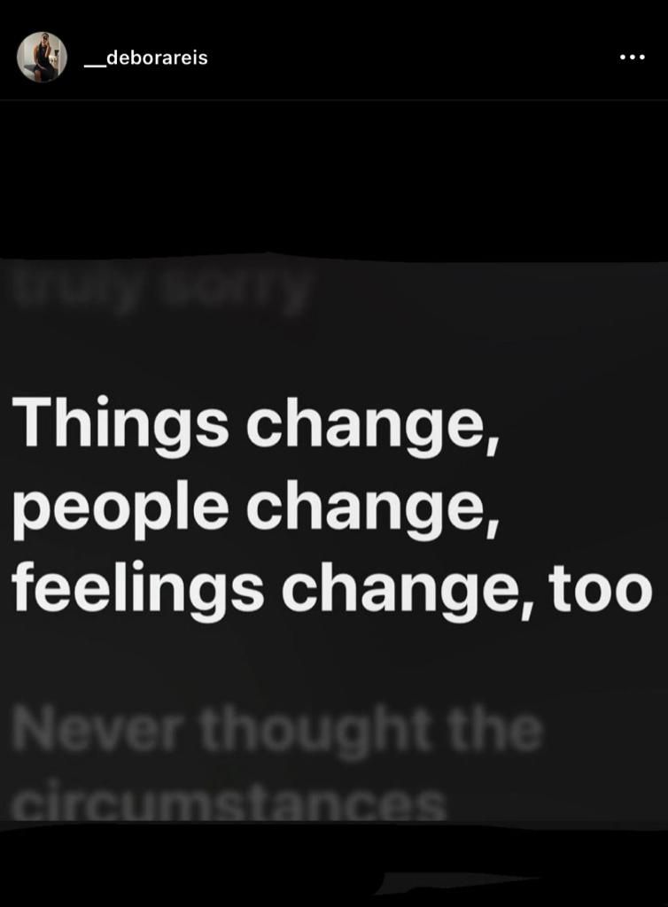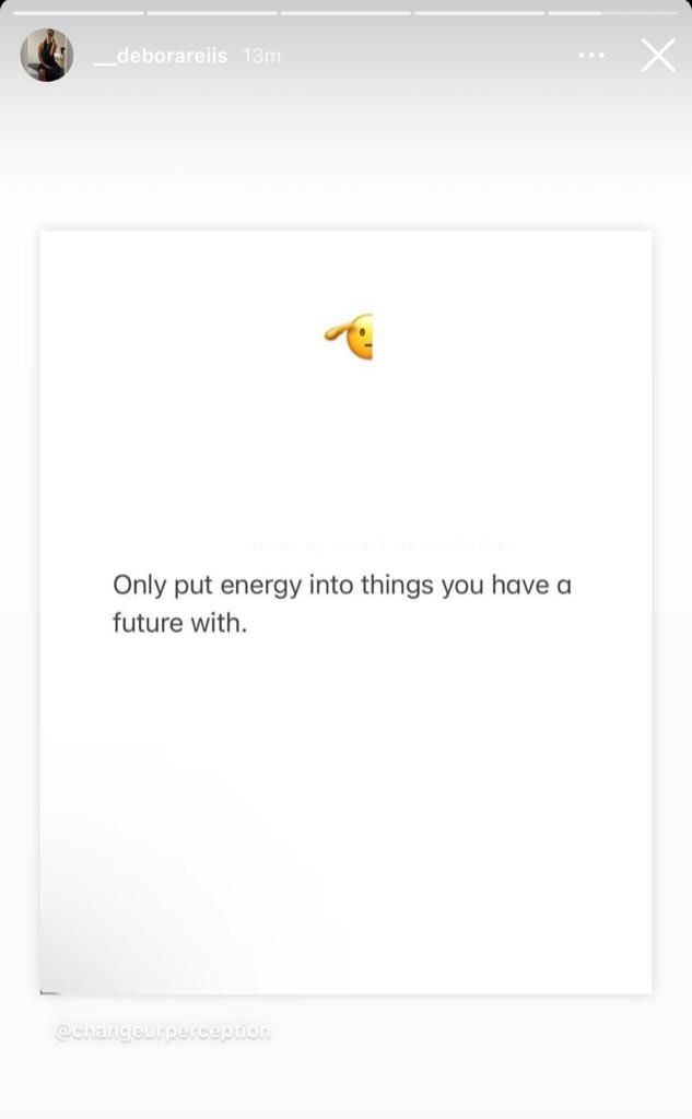 Last week Wednesday, Debora also uploaded a post on her story with a caption that read: ‘Only put energy into things you have a future with’.