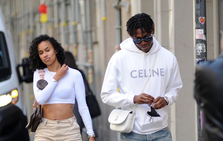 Rafael Leao walks through the streets of Milan with his girlfriend Debora Reis in April 2022/photo via Imago