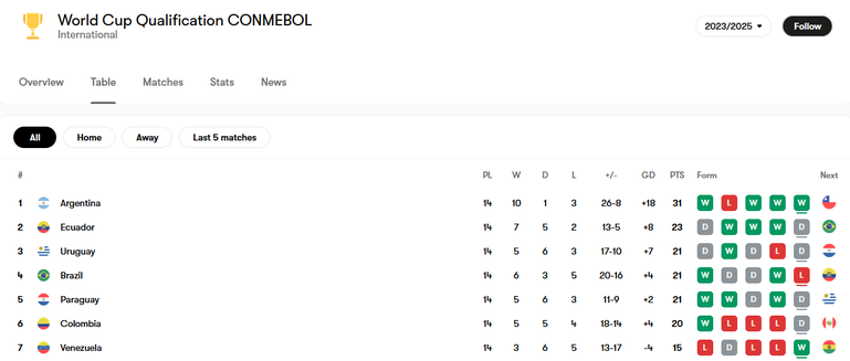 Five-time winners of the FIFA World Cup Brazil are tied on 21 points with Uruguay and Paraguay after 14 matches. Argentina have 31 points and have booked a placed at the 2026 fiesta already.
