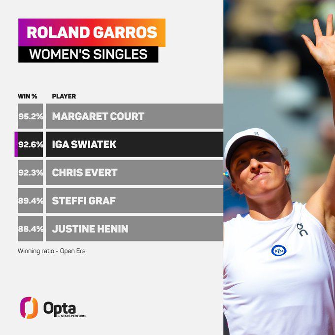 Swiatek has a winning ratio of 92.6% - Only Margaret Court (95.2%) has a higher winning ratio at Roland-Garros in the Open Era, surpassing Chris Evert's (92.3%).
