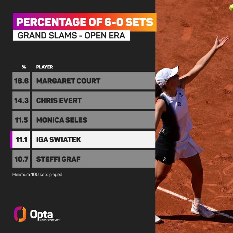 Following a 6-4 6-0 win over Claire Liu in the second round, Iga Swiatek has now surpassed Steffi Graf's (10.7%) for the percentage of sets in women's singles Grand Slams won with a 6-0 scoreline, at 11.1% (17/153) - min in 100 sets played.