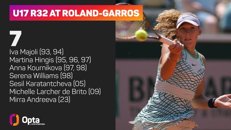 Mirra Andreeva became the seventh player under the age of 17 to reach the third round in women's singles at Roland Garros since 1993. Three were eventual finalists at the event - Majoli, Hingis, and Serena Williams.