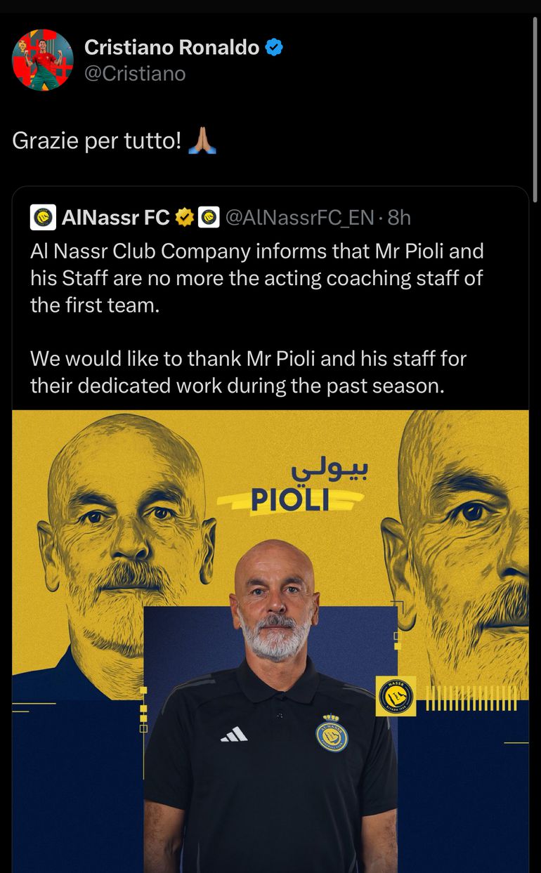 Replying to the club's post, the Portuguese superstar simply wrote, "thanks for everything 🙏," a clear indication of his high regard for Pioli's contributions during his tenure.