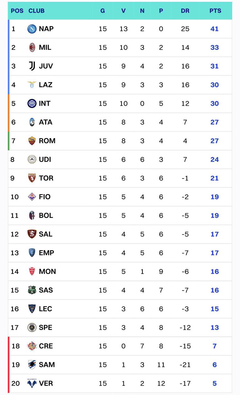 Napoli led the way after 15 games heading into 2023, with AC Milan, Juventus and Lazio completing the top four. AC Milan, the Bianconeri, Maurizio Sarri's men and Inter Milan were followed by Atalanta and Roma to complete the league's top seven.