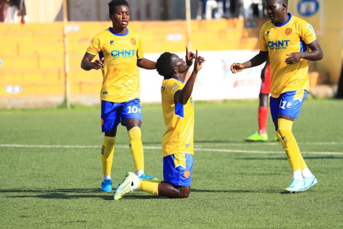 Julius Poloto celebrates a goal Allan Okello (L) and Muhammad Shaban last season (COURTESY PICTURE)