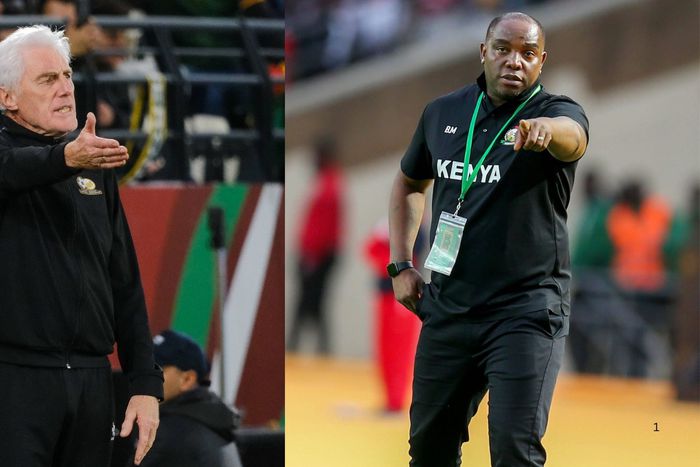 South Africa coach Hugo Broos and Harambee Stars boss Benni McCarthy. Image: Imago