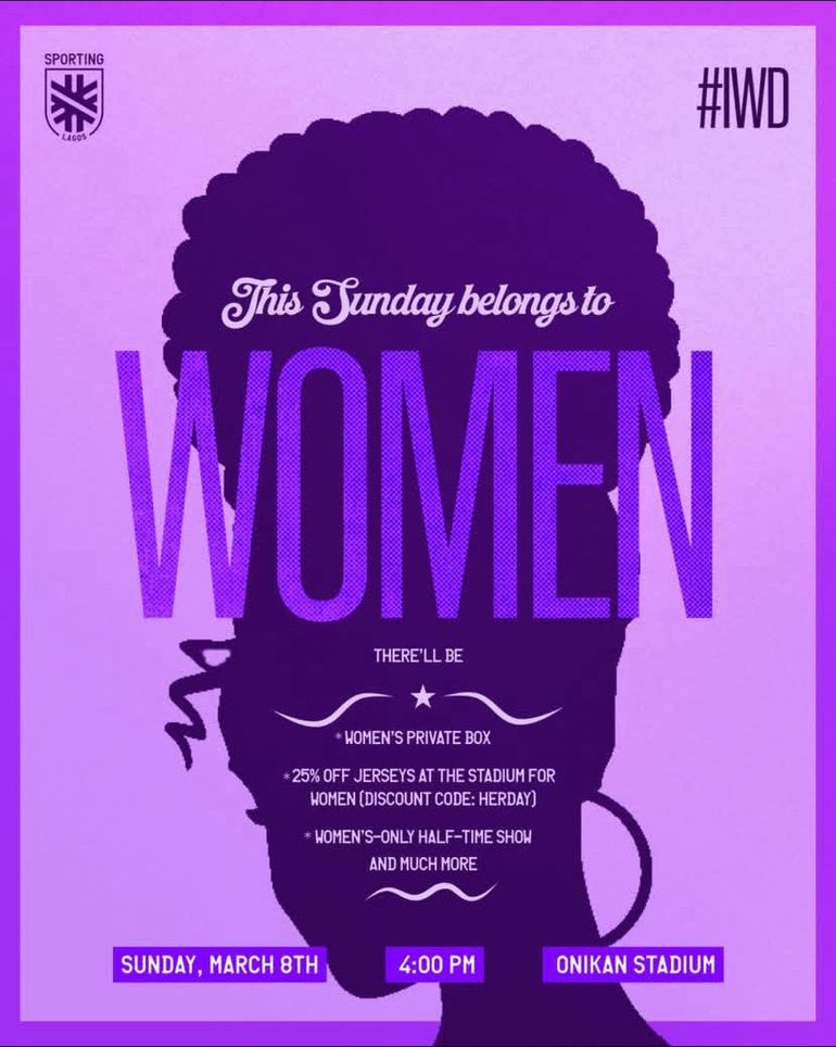 There is a private box for female fans, a halftime show dedicated to the women, free Sporting Lagos swag on the day, and 25% off jerseys with the discount code HERDAY at checkout.