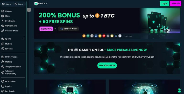 Mega Dice - Best Pick for Live Streaming Events + 200% Bonus up to 1 BTC + 50 Free Spins + Sports Free Bet