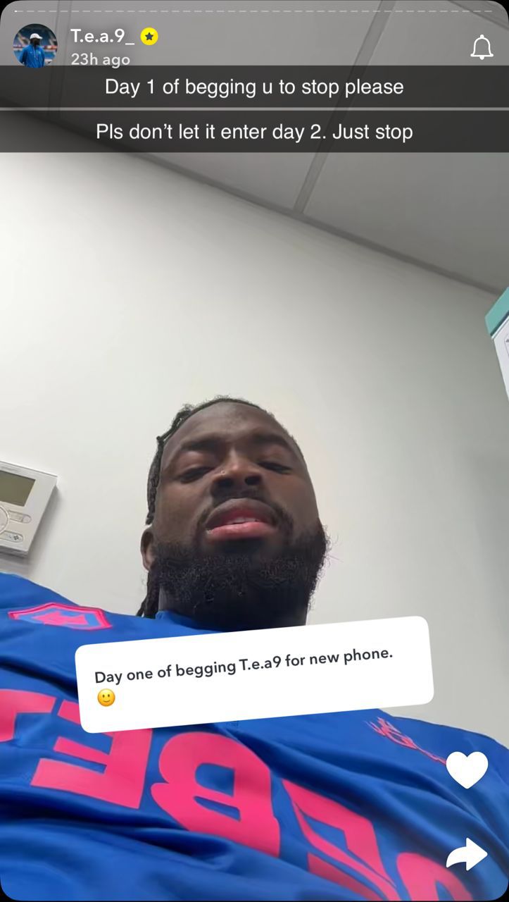 This latest exchange was shared just 23 hours ago on his Snapchat. Arokodare, 25, shared a follower's plea for a new phone. The message read: "Day one of begging T.e.a 9 for new phone," with a smiley emoji.