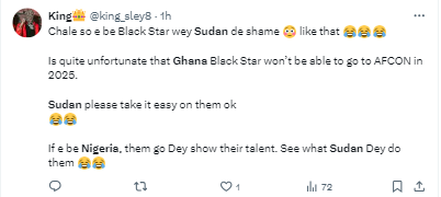 Nigerians however were online to troll the Ghanaians following their unexpected loss to Sudan that may cost them a spot at the next AFCON.