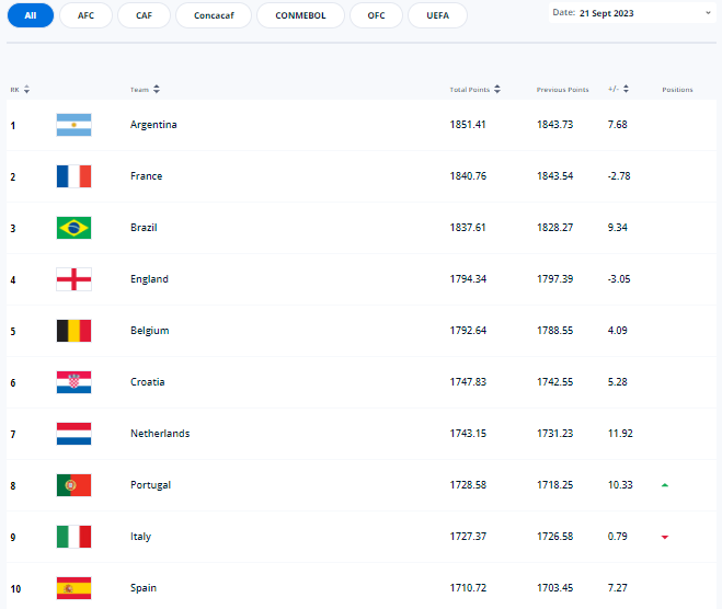 Reigning World Champions Argentina are top of the rankings, while France, Brazil, England, and Belgium wrap up the top five.