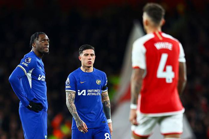 Chelsea's Axel Disasi and Enzo Fernandez look dejected during their 5-0 loss to Arsenal | Imago