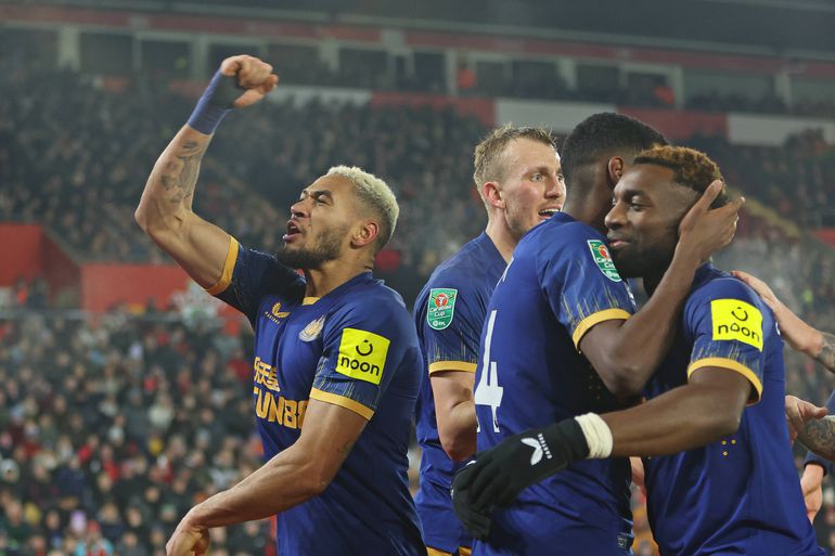 Newcastle United players celebrating their goal against Southampton in the first leg of the EFL Cup