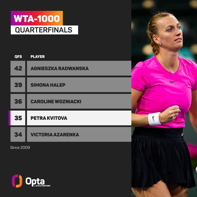 Petra Kvitova is the fourth player to achieve 35+ WTA-1000 quarterfinals after Agnieszka Radwanska (42), Simona Halep (39), and Caroline Wozniacki (36).