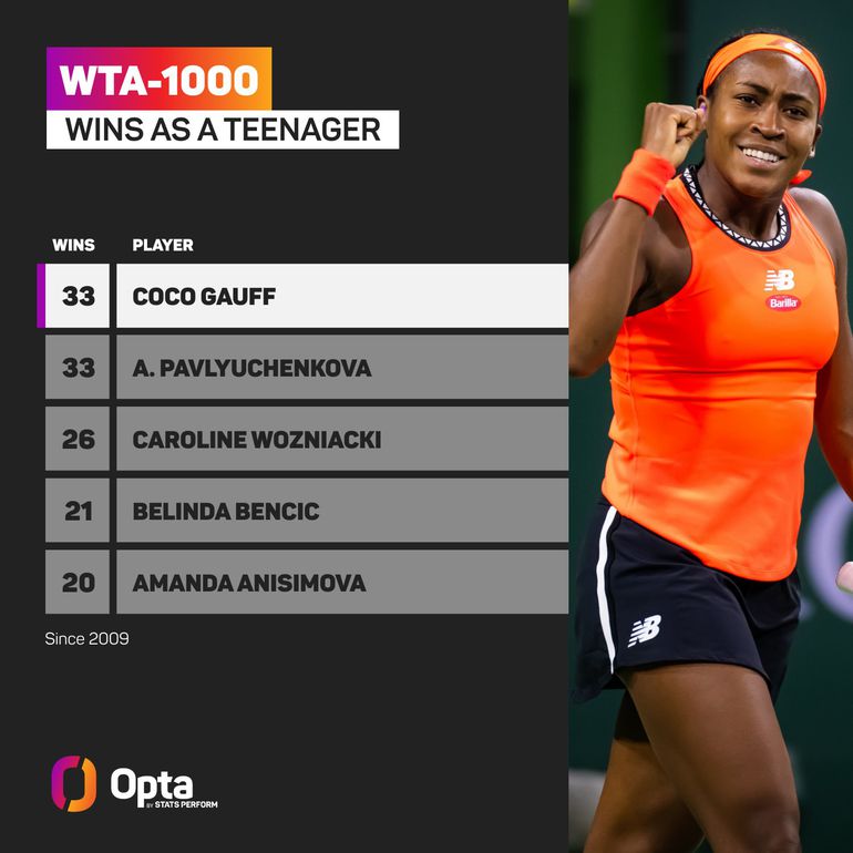 By reaching the quarterfinals in Indian Wells, Coco Gauff registered her 33rd win at WTA 1000 level. She now ties Anastasia Pavlyuchenkova for the most victories by a teenager at WTA 1000 level.