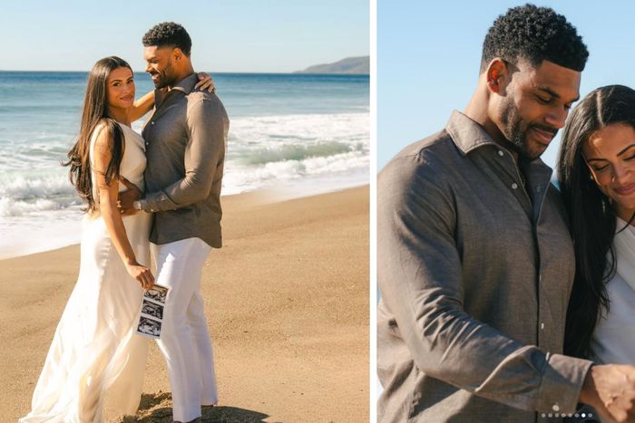 The couple shared the news with a series of heartwarming photos showing them on a beach, holding sonogram images of their baby.