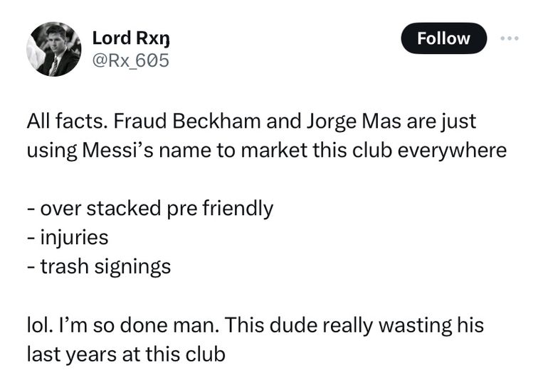 The user wrote: “ All facts. Fraud Beckham and Jorge Mas are just using Messi’s name to market this club everywhere