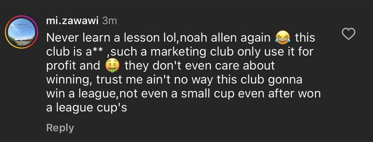 “Never learn a lesson lol, Noah Allen again this club is a** , such a marketing club only use it for profit and they don't even care about winning, trust me ain't no way this club gonna win a league, not even a small cup even after won a league cup's.”