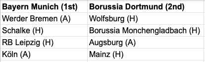 Three of Bayern’s opponents are in the bottom half, while Dortmund must defeat Wolfsburg and Mainz, teams chasing a European spot, to claim their first Bundesliga title since 2012.