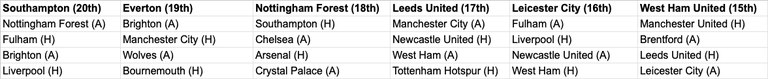 The Saints and Leeds account for four changes, highlighting the desperation to stay in the big time. These teams’ run-ins (below) throw up mouth-watering head-to-head clashes, which could potentially decide their fates.