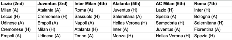 This weekend sets up attention-grabbing ties between Milan and Lazio, Roma and Inter and Atalanta and Juventus, the six teams chasing the three spots behind the champions.