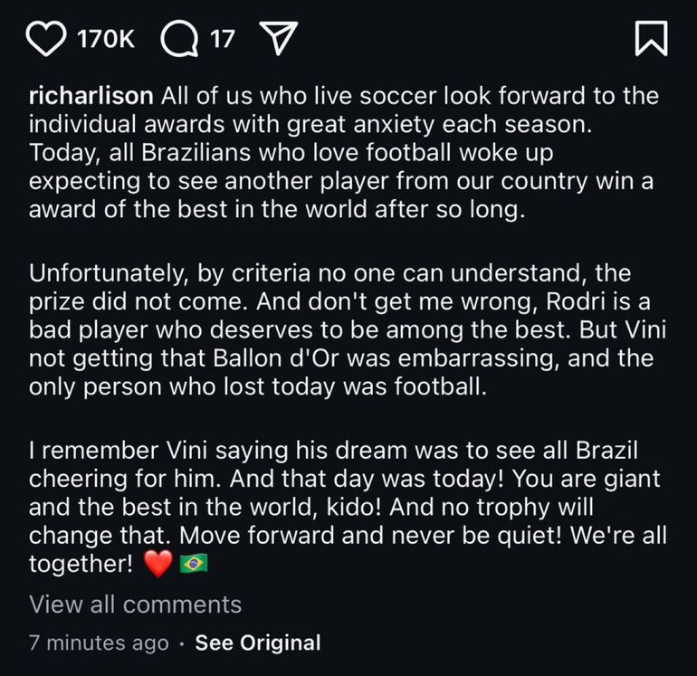 Richarlison statement after Vinicius lost the Ballon d'Or to Rodri | Credit: Instagram