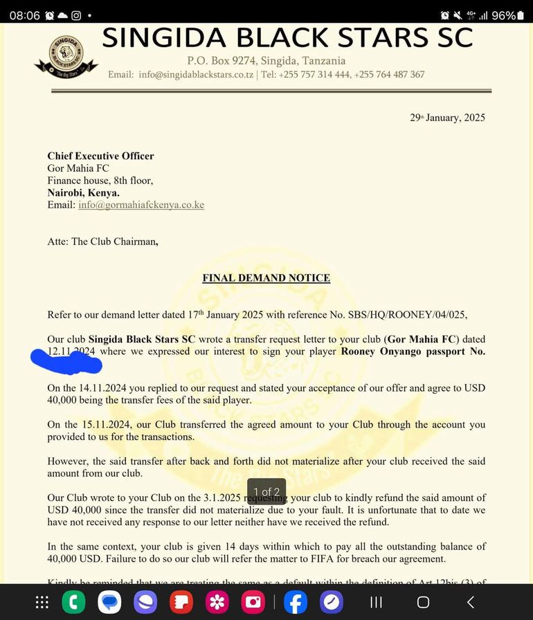 "Our Club wrote to your Club on 3.1.2025 requesting your club to kindly refund the said amount of USD 40,000 since the transfer did not materialise due to your fault,” reads a letter from Singida, sent to Gor Mahia on January 29.