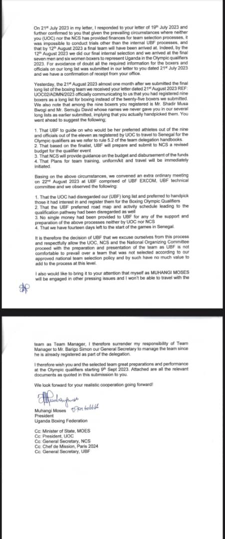 “I also would like to bring to your attention that I, as MUHANGI MOSES, will be engaged in other pressing issues and won’t be able to travel with the team as team manager.