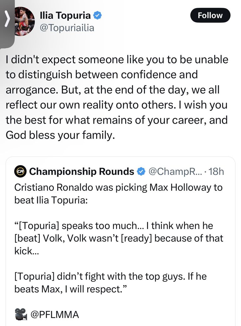 With this powerful rebuttal to Ronaldo, Topuria demonstrating that he is not only a skilled fighter but also someone unafraid to stand his ground against the world’s most followed athlete.
