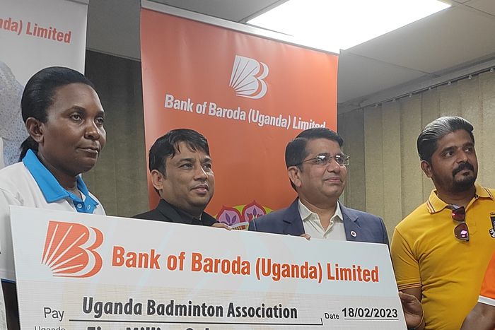 Bank of Baroda officials present a dummy cheque of UGX five million to Badminton federation officials as sponsorship for the Uganda international Badminton Championships | Courtesy photo