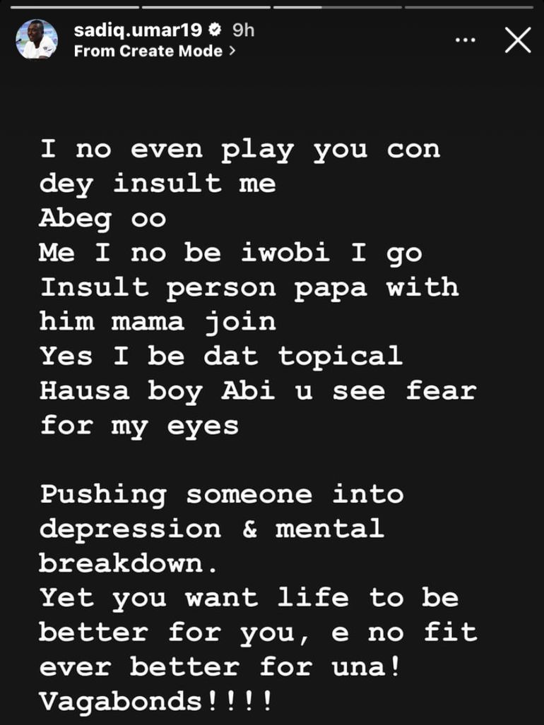“I no even play you con dey insult me,” Sadiq wrote on his Instagram story.