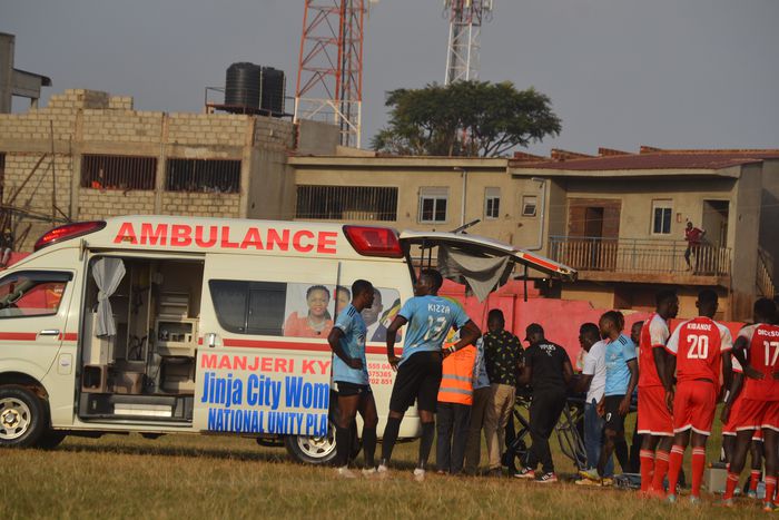 Jinja North United goalkeeper Fredrick Wangwa stretchered on the ambulance after colliding with Desire Tety | Photo by Fred Mwambu