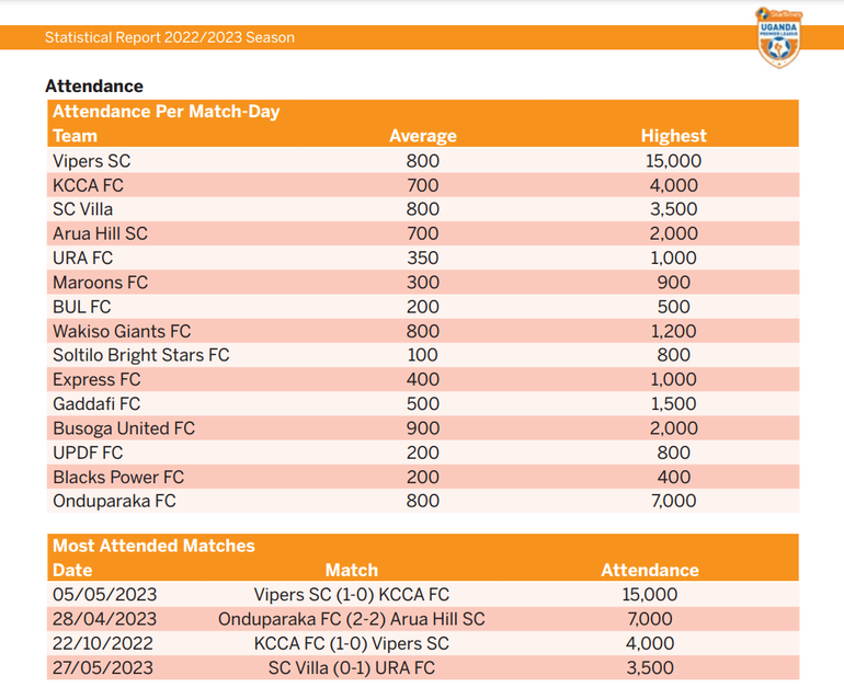Stastiscal breakdown of the Uganda Premier League attendance by spectators during the 2022/23 season | SUPL Report
