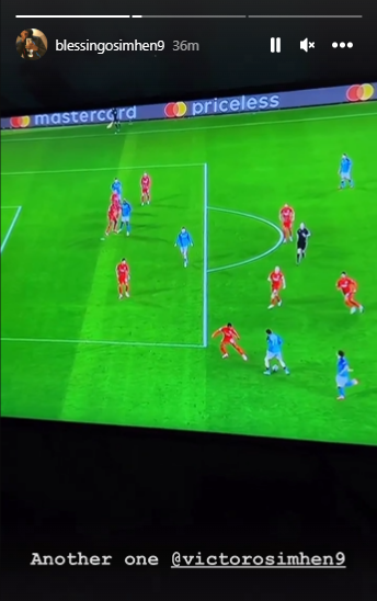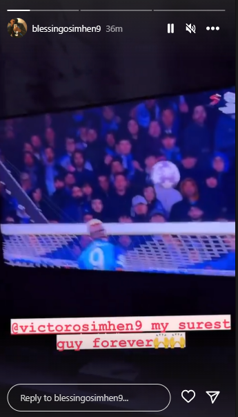 Having watched the match from home, she made a series of post on her Instagram story on Thursday, posting a video of the first goal which was a header from the striker and captioned it: ‘@victorosimhen9 my surest guy forever’