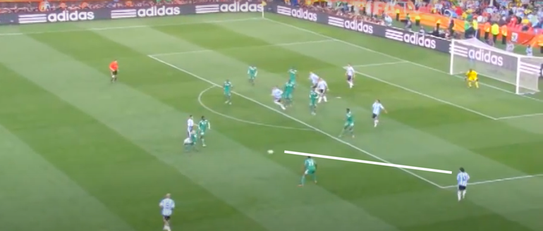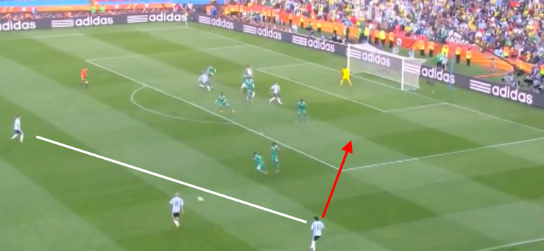 After receiving possession in the left half-space, a pair of give-and-goes between Messi and Di Maria opened up the Nigeria defence, bringing the Albiceleste man eyeball to eyeball with the Super Eagles shot-stopper.