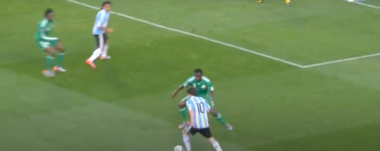 After receiving Tevez’s pass wide right, Messi carried the ball aggressively and skipped past Chinedu Obasi’s last-ditch attempt to prevent a shot at goal.