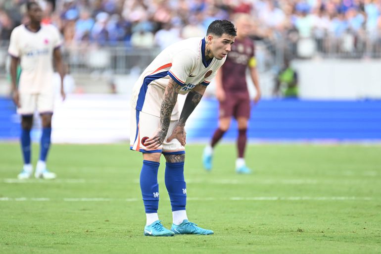 Enzo Fernandez looks dejected during Chelsea's pre-season match against Manchester City (Credit: Imago)