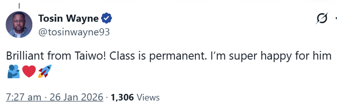 “He should be called the beast. What a baller!” one fan exclaimed. Another added, “Brilliant from Taiwo! Class is permanent. I’m super happy for him.”