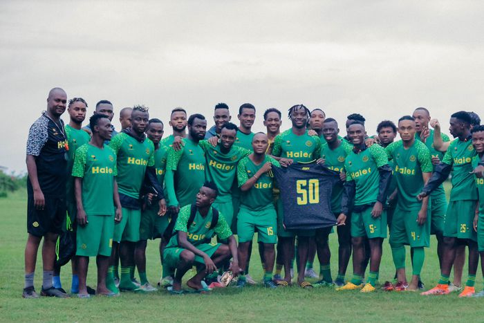 Fiston Mayele stands with his teammates for a photo moment with his 50 goals jersey the club presented to him (courtesy)